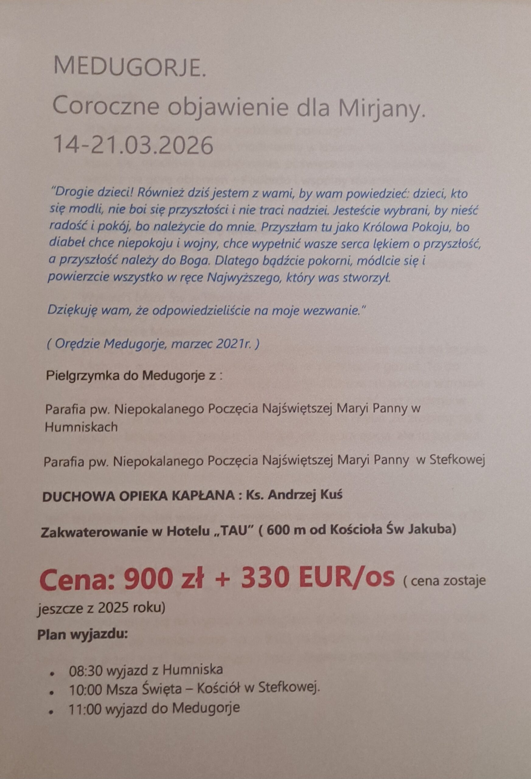 Zapraszamy serdecznie na pielgrzymkę do Medugorie!